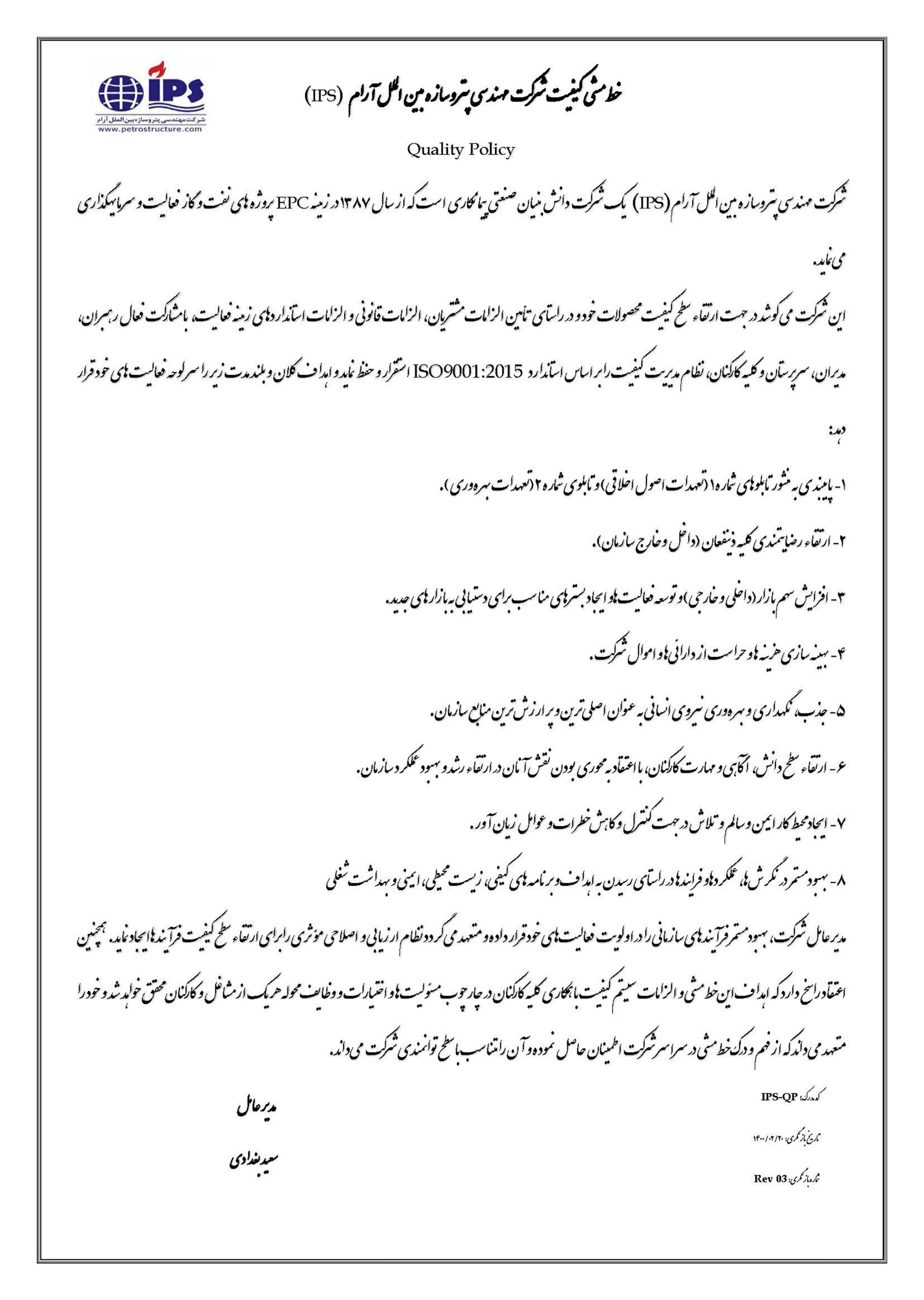 مدیر عامل شرکت، بهبود مستمر فرآیندهای سازمانی را در اولویت فعالیتهای خود قرار داده و متعهد میگردد نظام ارزیابی و اصلاحی مؤثری را برای ارتقاء سطح کیفیت فرآیندها ایجاد نماید. همچنین اعتقاد راسخ دارد که اهداف این خط مشی و الزامات سیستم کیفیت با همکاری کلیه کارکنان در چارچوب مسئولیتها و اختیارات و وظایف محوله هر یک از مشاغل و کارکنان محقق خواهد شد و خود را متعهد میداند که از فهم و درک خط مشی در سراسر شرکت اطمینان حاصل نموده و آن را متناسب با سطح توانمندی شرکت میداند.